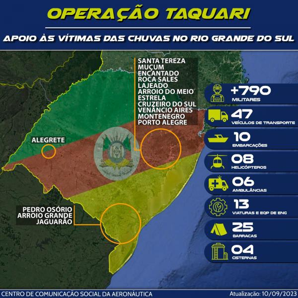 Mais de 790 militares da Marinha do Brasil, Exército Brasileiro e Força Aérea Brasileira atuam em municípios do Rio Grande do Sul atingidos pelas enchentes na região do Vale do Taquari. A Operação Conjunta das Forças Armadas estende-se também à região Sul e à fronteira Oeste do Estado, onde as chuvas provocaram cheias dos rios e deixaram desabrigados.