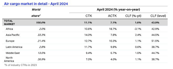 As companhias aéreas da África apresentaram aumento de 10,6% na demanda por carga aérea em abril de 2024 em comparação com o mesmo mês de 2023. A demanda no mercado África-Ásia aumentou 25,8% em comparação com abril de 2023. A capacidade de abril subiu 18,7% em relação ao mesmo período de 2023.