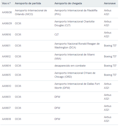 A companhia aérea operará vários voos adicionais com mais de 2.000 assentos na noite de terça-feira, 8 de outubro, partindo de MCO para permitir que os clientes que gostariam de evacuar por via aérea tenham a oportunidade de fazê-lo. Isso é um acréscimo aos mais de 2.000 assentos operados pela American no Aeroporto Internacional de Tampa (TPA) e no Aeroporto Internacional Sarasota Bradenton (SRQ) em 7 de outubro: