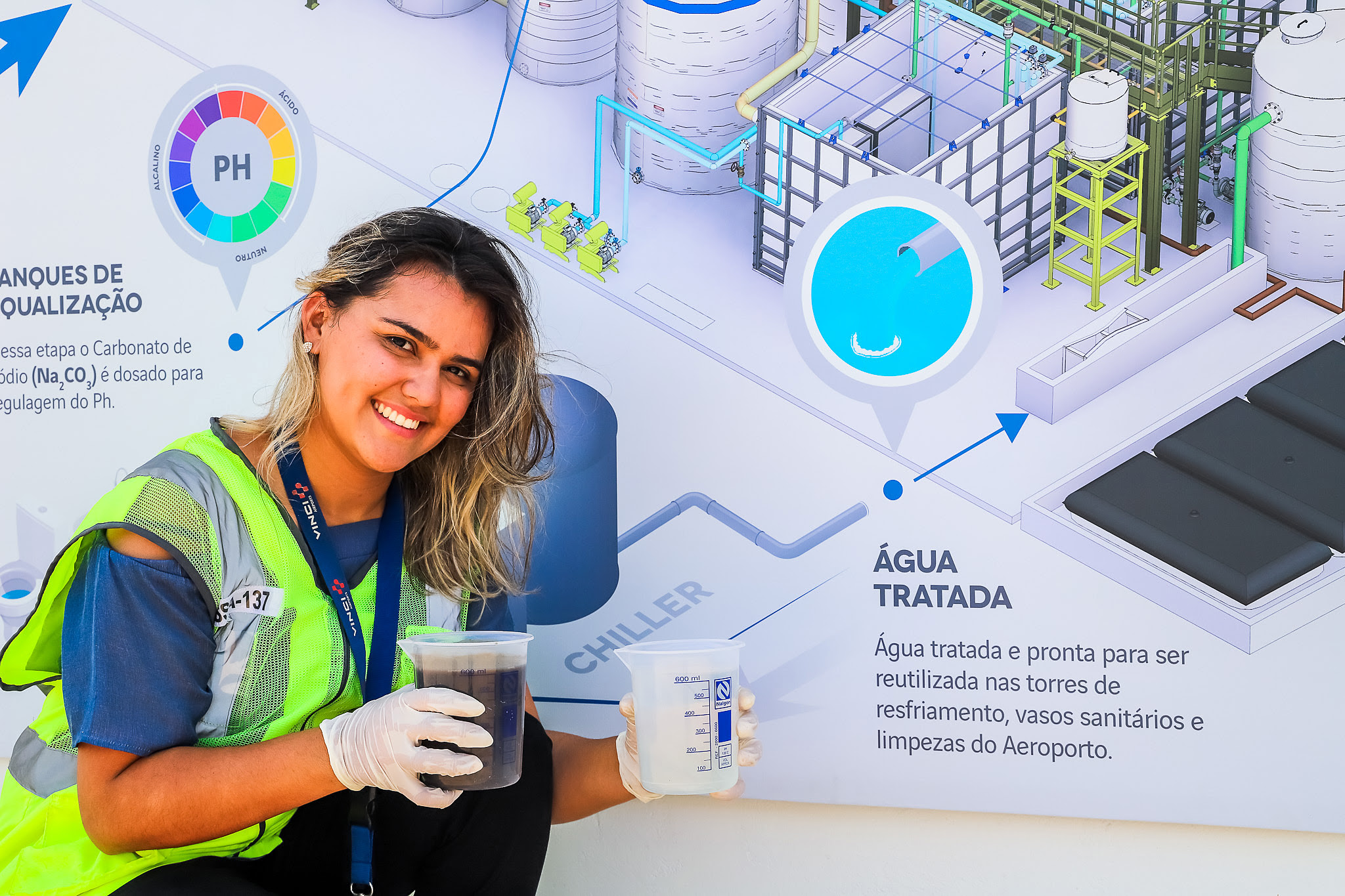 A iniciativa foi premiada na categoria “ESG” e se refere principalmente à geração e implantação de um sistema de água de reuso. Atualmente, todo efluente gerado no Aeroporto é encaminhado para uma Estação de Tratamento de Efluentes (ETE) e tratado. Como resultado, há a geração de água não-potável de alta qualidade, que é utilizada na limpeza de áreas comuns e nas descargas dos banheiros. Entre as fontes de água de reuso também está inclusa a água de condensação dos aparelhos de ar-condicionado, destinada às torres de resfriamento.
