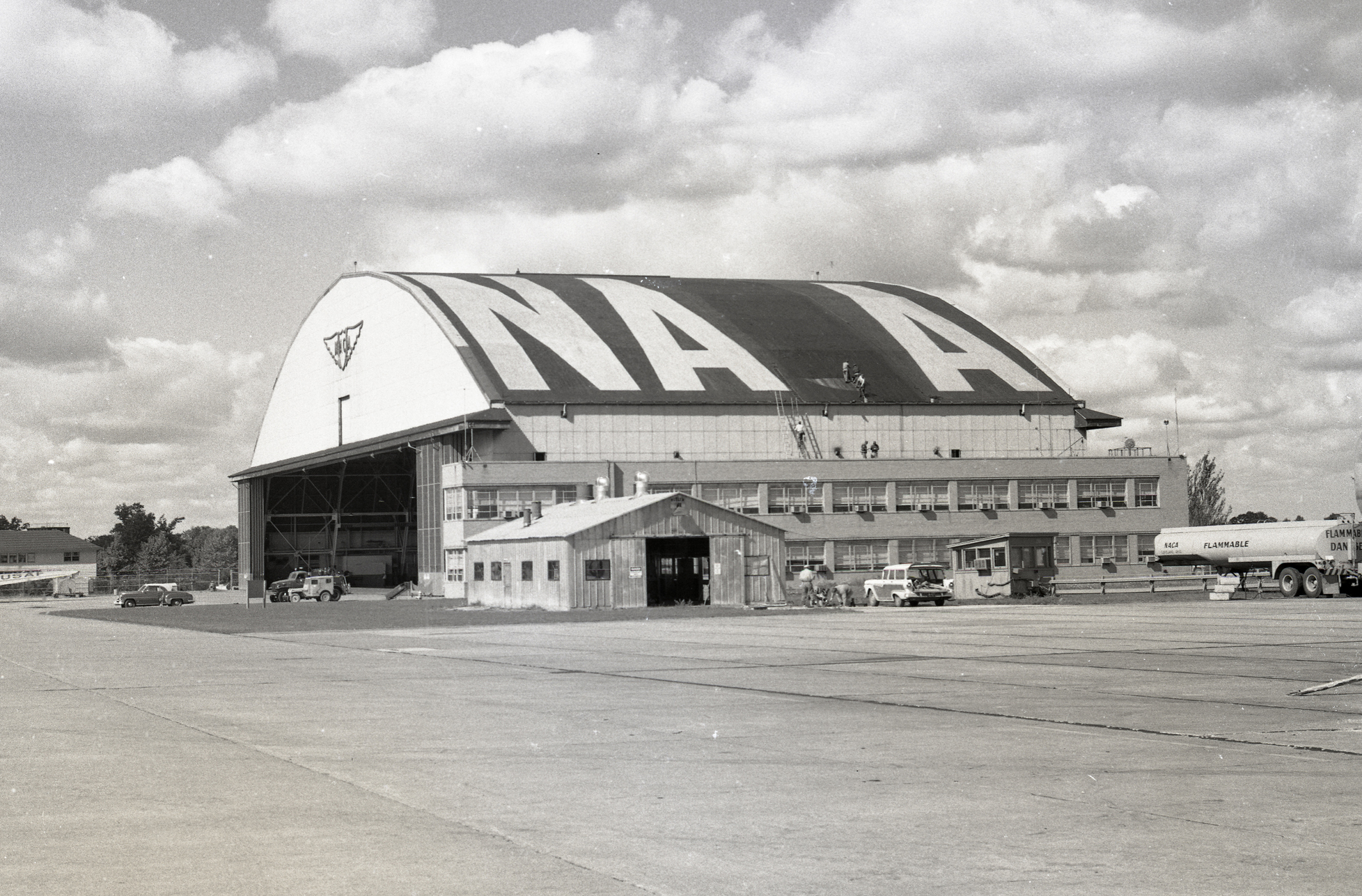 No outono de 1941, o Comitê Consultivo Nacional para Aeronáutica (NACA) concluiu o primeiro edifício de seu laboratório em Cleveland: o hangar. As letras “NACA” sobre um par de asas foram instaladas acima das entradas dianteira e traseira da aeronave logo em seguida. Em 1946, “NACA” foi pintado em grandes letras brancas no telhado preto voltado para o aeroporto. Essa configuração permaneceu em vigor por doze anos.