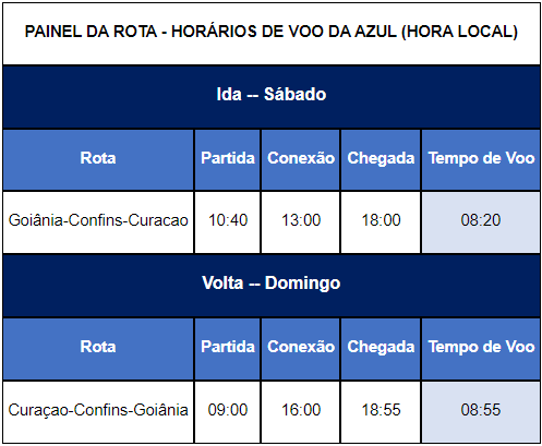 Os voos com destino à Curaçao sairão do Aeroporto de Goiânia, aos sábados, às 10h40, com conexão às 13h em Confins – e pousarão na ilha holandesa no Caribe às 18h00. Os voos de retorno à Goiânia acontecerão aos domingos, decolando de Curaçao às 09h00 e pousando em Confins às 16h, chegando a Goiânia às 18h55.