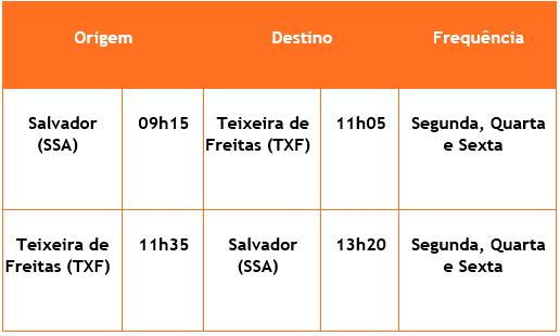 Confira, abaixo, as frequências e horários dos voos entre Teixeira de Freitas (TXF) e Salvador (SSA):