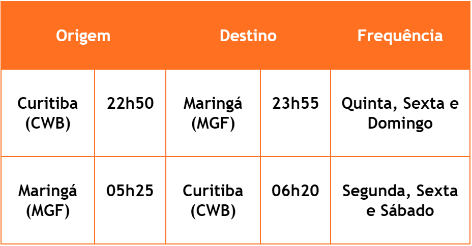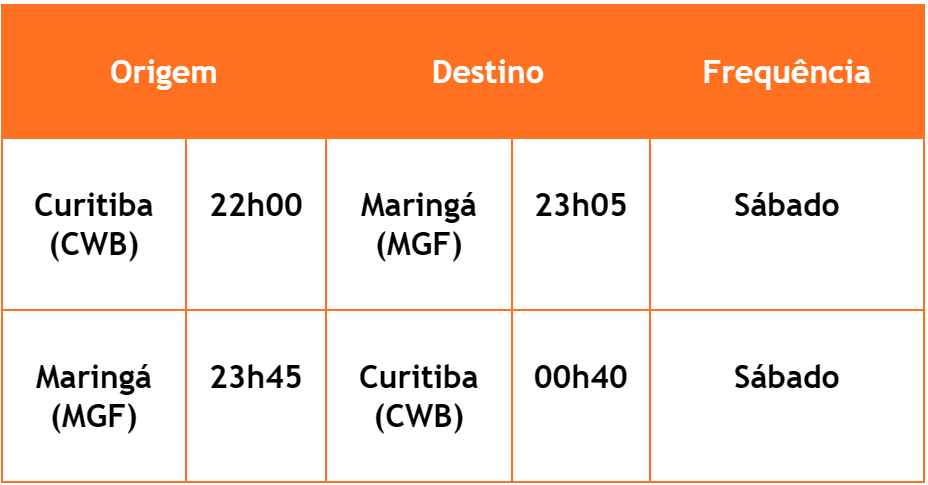 A nova rota favorece a geração e o desenvolvimento de negócios, fomenta o turismo na região e dinamiza o transporte de cargas, impulsionando a economia e criando oportunidades de desenvolvimento regional. O voo de Curitiba para Maringá tem partida programada às 22h00, com chegada às 23h05. O retorno está previsto para decolar do Aeroporto Internacional de Maringá às 23h45, com pouso em Curitiba às 00h40.