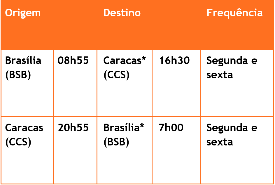 A GOL Linhas Aéreas, principal Companhia Aérea do Brasil, comprometida em expandir sua malha internacional, anuncia o lançamento de sua nova operação para Caracas (CCS), a partir de 31 de março de 2025. Esta nova rota terá duas frequências semanais ligando Brasília a Caracas, com uma escala em Bogotá.