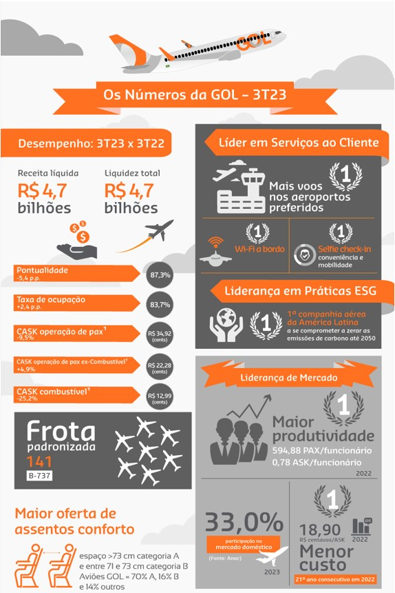 Celso Ferrer, Diretor Presidente, comentou: “Graças ao excelente trabalho do nosso Time de Águias, continuamos a fortalecer nossa confiabilidade operacional para nossos Clientes que contribuiu para entregar receita recorde no terceiro trimestre com margem operacional de 17,7%, entre as melhores do setor. Nossa estratégia de diversificar nossos fluxos de receitas, principalmente com Smiles e Gollog, capitalizar oportunidades de crescimento e inovar continuamente para aprimorar nossos produtos para nossos Clientes demonstra que estamos na direção correta e nos permitindo alcançar resultados consistentes em 2023.”