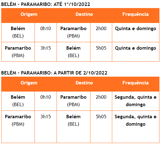 Hoje, o voo G3 7473 sai de Belém à 0h10 e pousa em Paramaribo às 2h00 da manhã (horário local), às quintas e domingos. Já na volta à capital paraense, o voo G3 7472 decola do Suriname às 3h15, com pouso no Brasil às 5h05, nos mesmos dias da semana. A partir de 2 de outubro deste ano, as frequências passam a ser às segundas, quintas e domingos, tanto a ida quanto a volta.