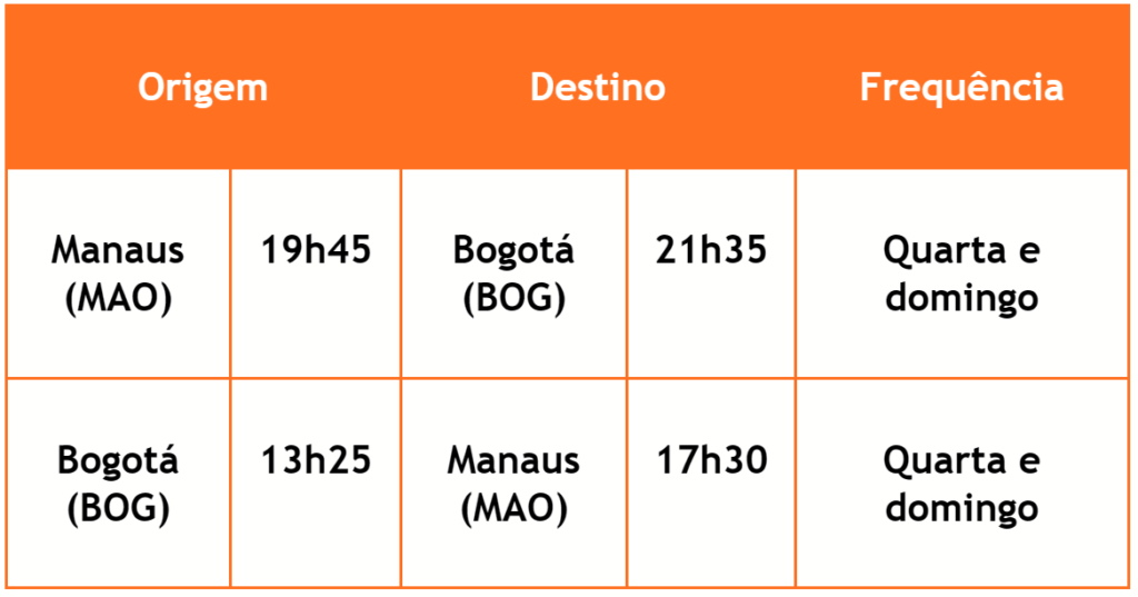 Desde o dia 2 de abril deste ano, às quartas e aos domingos, o voo G3 8248 deixa Bogotá às 13h25 e aterrissa em Manaus às 17h30. Às 19h45, o G3 8249 parte da capital amazonense, pousando no aeroporto El Dorado, em Bogotá, às 21h35. O voo tem 2 horas e 50 minutos de duração.