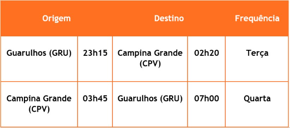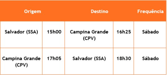 Confira, abaixo, as frequências e horários dos voos extras entre Salvador (SSA) e Campina Grande (CPV) e entre Guarulhos (GRU) e Campina Grande (CPV):