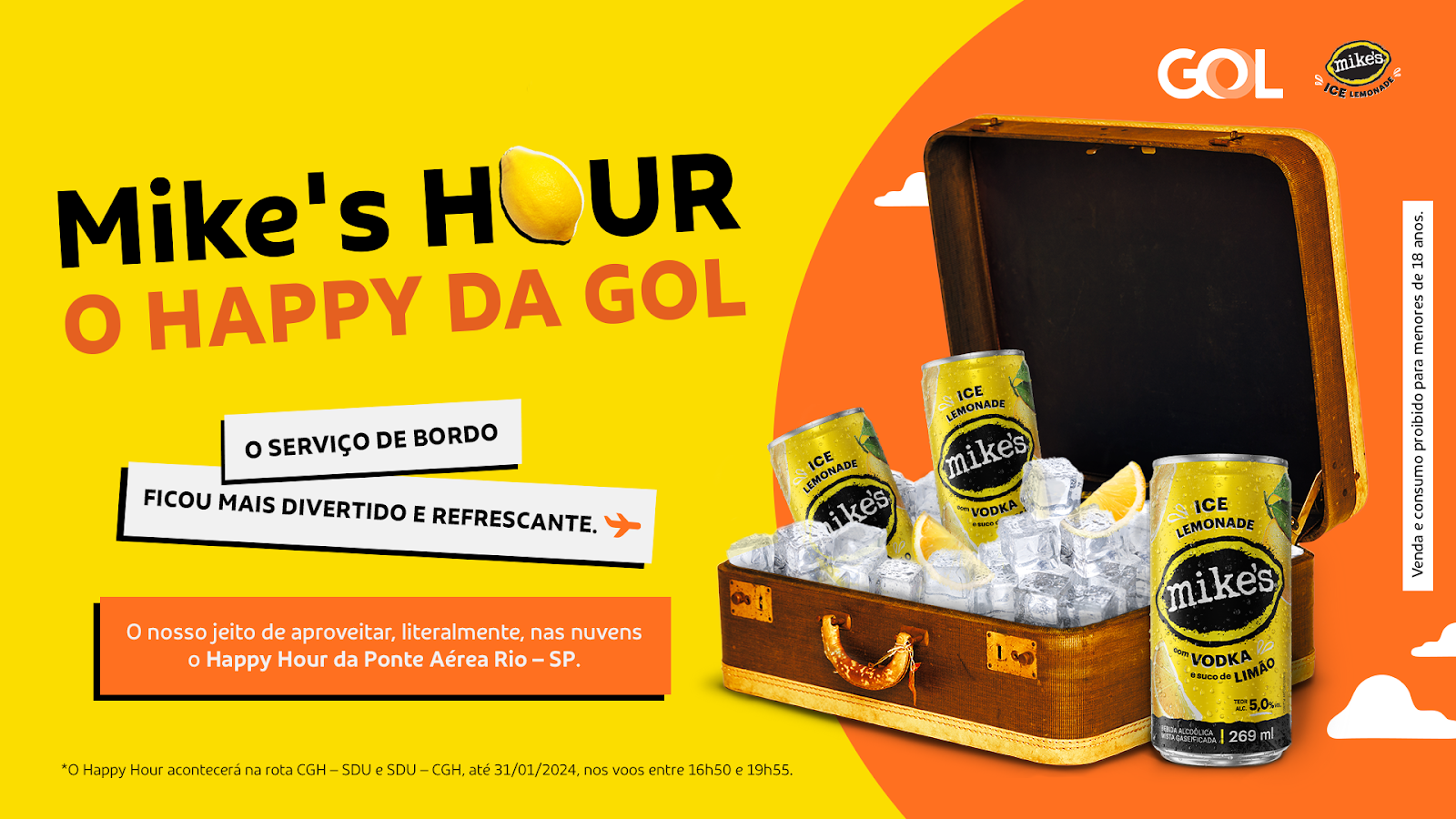 A GOL Linhas Aéreas terá um serviço de bordo especial para seus Clientes entre dezembro e janeiro. Passageiros que voarem de segundas às sextas feiras em voos de final de tarde saindo de Congonhas (CGH) e Santos Dumont (SDU) poderão desfrutar de um Happy Mike’s, um happy hour com Mike’s Ice, o drink pronto feito de vodka com suco de limão da Ambev.