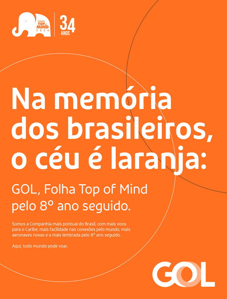 “Qual a primeira marca que lhe vem à cabeça quando se fala em…?”. Fruto de uma pergunta livre, nada sugestiva, o prêmio Folha Top Of Mind chega à sua 34ª edição em 2024, elencando as marcas brasileiras mais lembradas pelo público e pelos consumidores em diferentes categorias. Pelo oitavo ano consecutivo, e com pontuação 30 – ou seja, com 30% das menções de voto -, a GOL Linhas Aéreas, mais uma vez, sagrou-se campeã na categoria Companhia Aérea, na tradicional pesquisa conduzida anualmente pelo jornal Folha de S.Paulo.