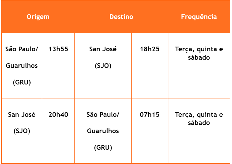 São Paulo/Guarulhos (GRU) – San José (SJO): a partir de 12/11/2024