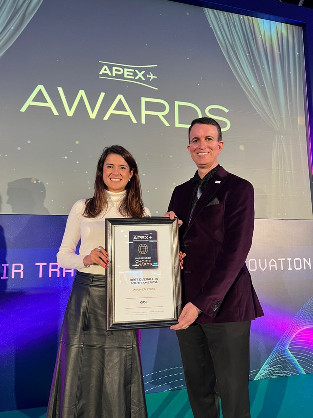 A GOL Linhas Aéreas, maior Companhia do Brasil, recebeu nesta quarta-feira (24) o prêmio APEX Passenger Choice Award® 2023 de Melhor Companhia Aérea da América do Sul, em Dublin, na Irlanda, durante o Future Travel Experience EMEA, Ancillary & Retailing Event, que teve início no dia 23 e segue até amanhã (25). A APEX homenageia companhias aéreas de quatro continentes: África, Europa, América do Norte e América do Sul.