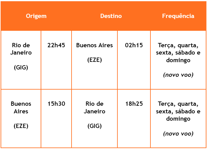 São 5 frequências semanais sem escalas, às terças, quartas, sextas, sábados e domingos, tanto a ida quanto a volta. O novo voo decolará de GIG às 22h45, pousando em EZE às 02h15. A volta acontecerá às 15h30, partindo de EZE, com aterrissagem no Rio de Janeiro às 18h25, de segunda-feira a domingo. Os voos da GOL são operados com as modernas aeronaves Boeing 737, que, em configuração internacional, têm capacidade para até 176 passageiros.