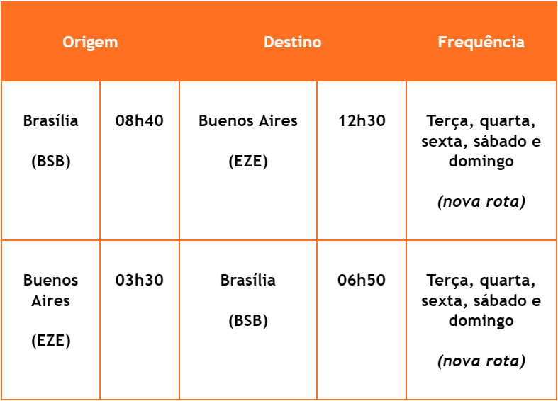 A nova rota ligará as capitais do Brasil e da Argentina com 5 frequências semanais. A partir de Brasília, serão .