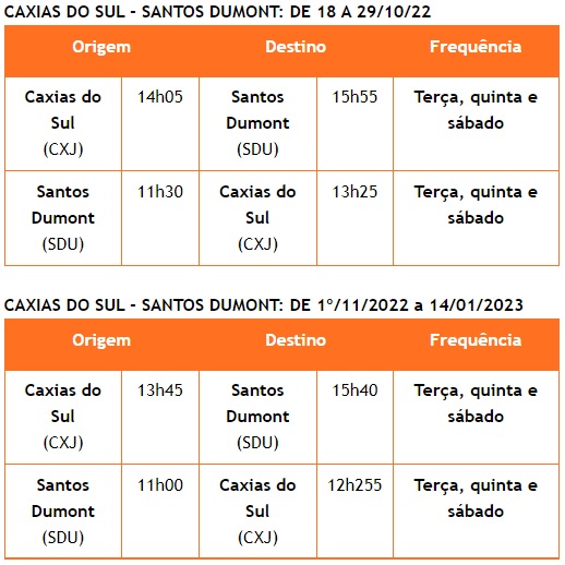 Confira, abaixo, os horários e frequências dos voos de Caxias do Sul (CXJ) e Rio de Janeiro/Santos Dumont (SDU):