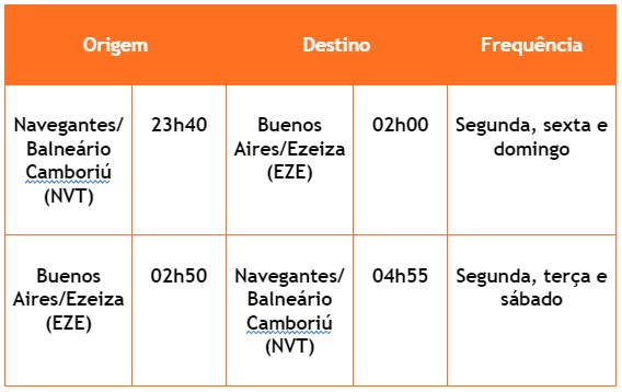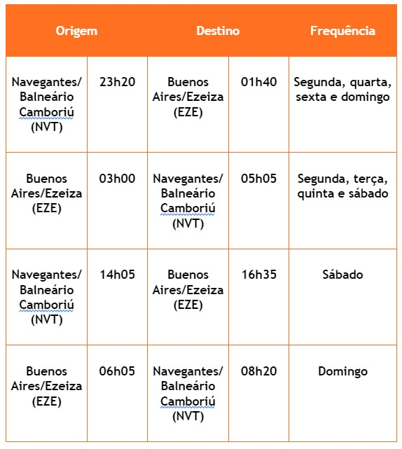 Entre o início de janeiro e o sábado seguinte ao Carnaval (17/02), serão 5 frequências semanais entre as cidades. A partir de Navegantes/Balneário Camboriú, há opções de voos noturnos, assim como no meio da tarde [veja tabelas de frequências e horários abaixo]. Já as saídas de Buenos Aires/Ezeiza rumo ao litoral norte catarinense vão se dividir entre a madrugada e o início da manhã. No período entre 18 de fevereiro e 30 de março de 2024, estarão disponíveis 3 frequências semanais aos clientes, nos dois sentidos.