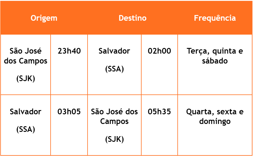 No período entre os dias 2 e 31 de julho serão disponibilizadas pela GOL três saídas semanais de ida e volta entre São José dos Campos e a capital baiana, contemplando os Clientes que viajam a lazer para o Nordeste.