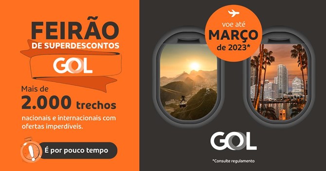 A hora de se programar para voar barato até março de 2023, com a GOL Linhas Aéreas, é agora. A maior Companhia Aérea do Brasil promove um fim de semana com descontos imperdíveis em mais de 2 mil trechos nacionais e internacionais. O Feirão de Superdescontos GOL tem início nesta sexta-feira (23/09), às 17h, e segue até às 8h da próxima segunda-feira (26/09). Portanto, os Clientes precisam ser rápidos para garimpar a tempo as melhores ofertas disponíveis.