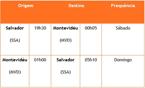 Confira, abaixo, as frequências e horários de voos entre Salvador (SSA) e Montevidéu (MVD):