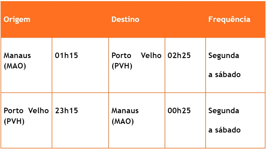 De segunda a sábado, a partir de 27/10, o voo G3 1917 partirá de Porto Velho às 23h15 e aterrissará na capital do Amazonas à 0h25. A volta, nos mesmos dias, a partir de Manaus, acontecerá à 01h15 (voo G3 1916), com pouso às 02h25 na capital rondoniense.
