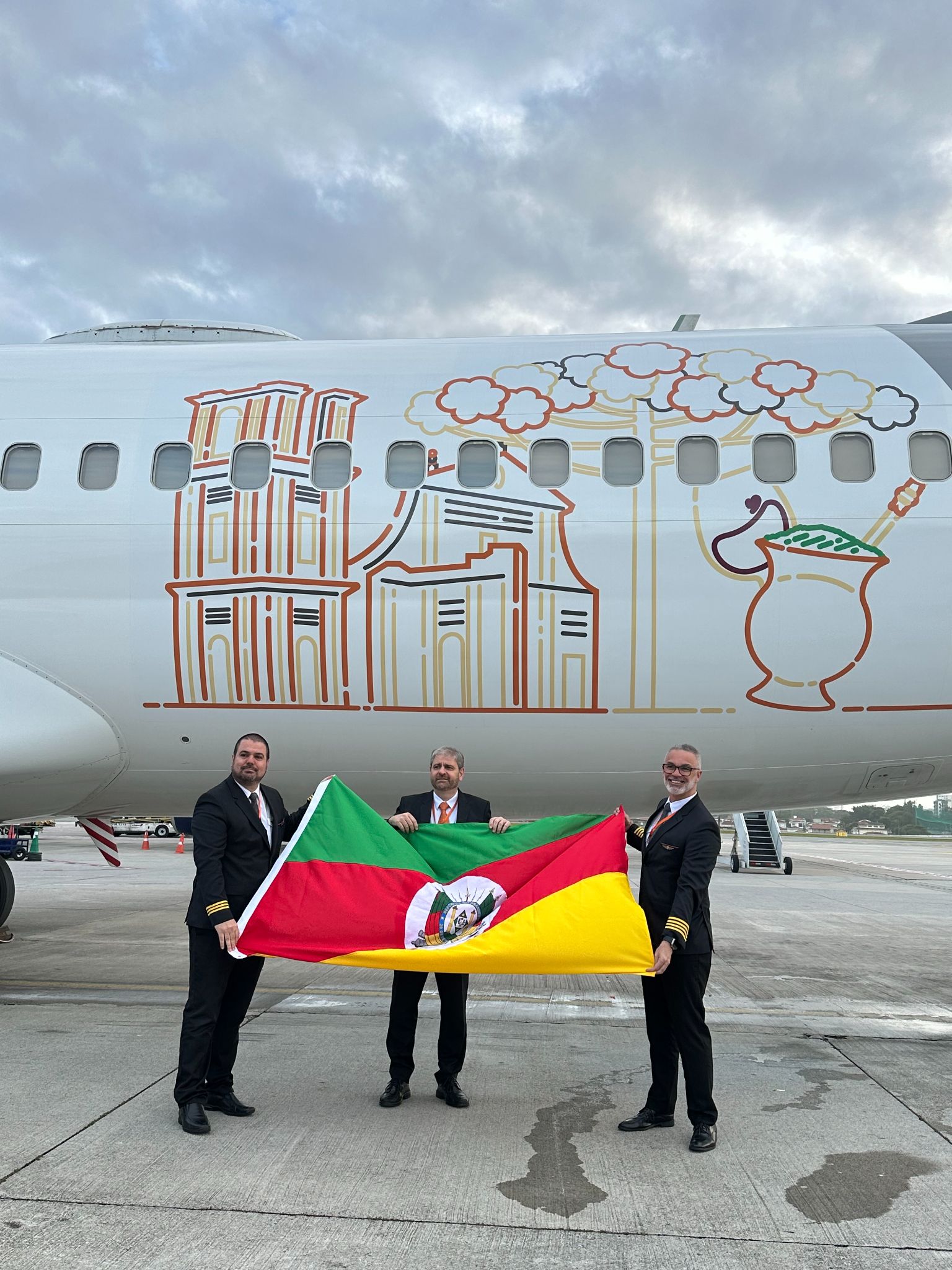 O voo G3 1210, que partiu às 7h00 do aeroporto de Congonhas (CGH) e pousou em Porto Alegre às 8h25, foi operado com o Boeing 737 800 da GOL adesivado para a iniciativa “Conheça o Brasil: Voando”, idealizada pelo Ministério do Turismo em parceria com o Ministério de Portos e Aeroportos e a Abear. O equipamento traz, na parte externa, ilustrações exclusivas, desenvolvidas pelo Hub de Criação da GOL, que remetem à cultura gaúcha: a Ruína dos Sete Povos, localizada no Parque Histórico Nacional das Missões, a beleza das araucárias, além do vinho e do chimarrão, tão tradicionais no Rio Grande do Sul.