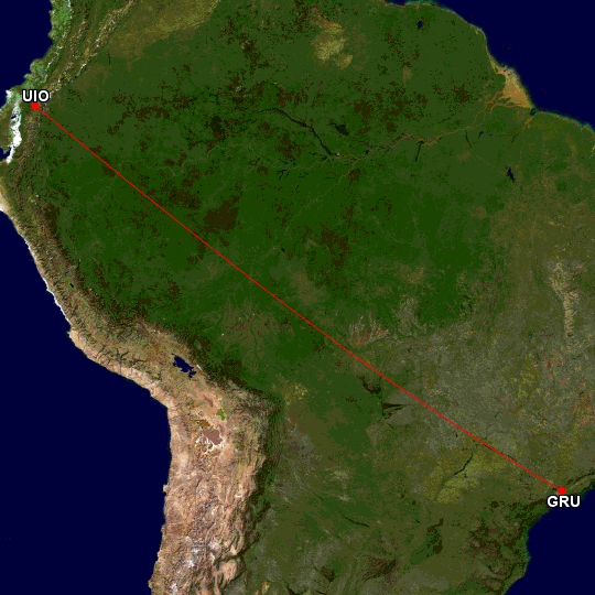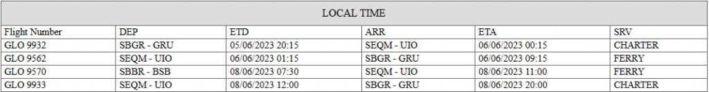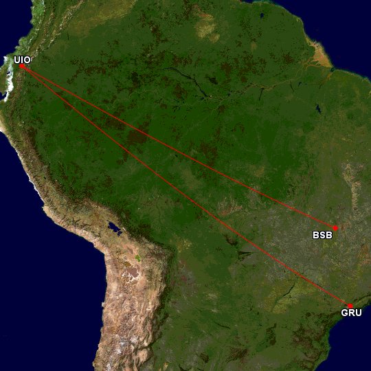 O voo de ida partiu do Aeroporto de Guarulhos no dia 05/06 às 20h15 pousando no Aeroporto Internacional Mariscal Sucre às 00h15 do dia 06/06, e regressou ao Brasil vazio, como mostra a tabela abaixo: