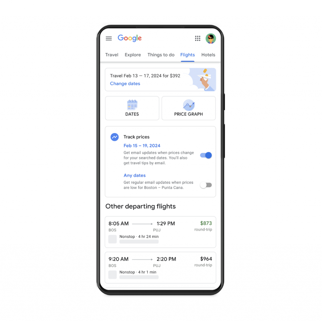 Para os usuários que desejarem esperar para economizar e buscar por tarifas mais baixas, o recurso de rastreamento de preços permitirá monitorar preços de passagens por períodos específicos ou não, permitindo que os usuários sejam notificados automaticamente caso os preços dos voos procurados caiam significativamente. No caso do rastreamento de preços para qualquer data, as opções serão apenas para rotas mais populares e com mais dados sobre voos futuros. De início, o rastreamento de preços para qualquer data aparecerá apenas para pesquisas de opções para um adulto em classe econômica.