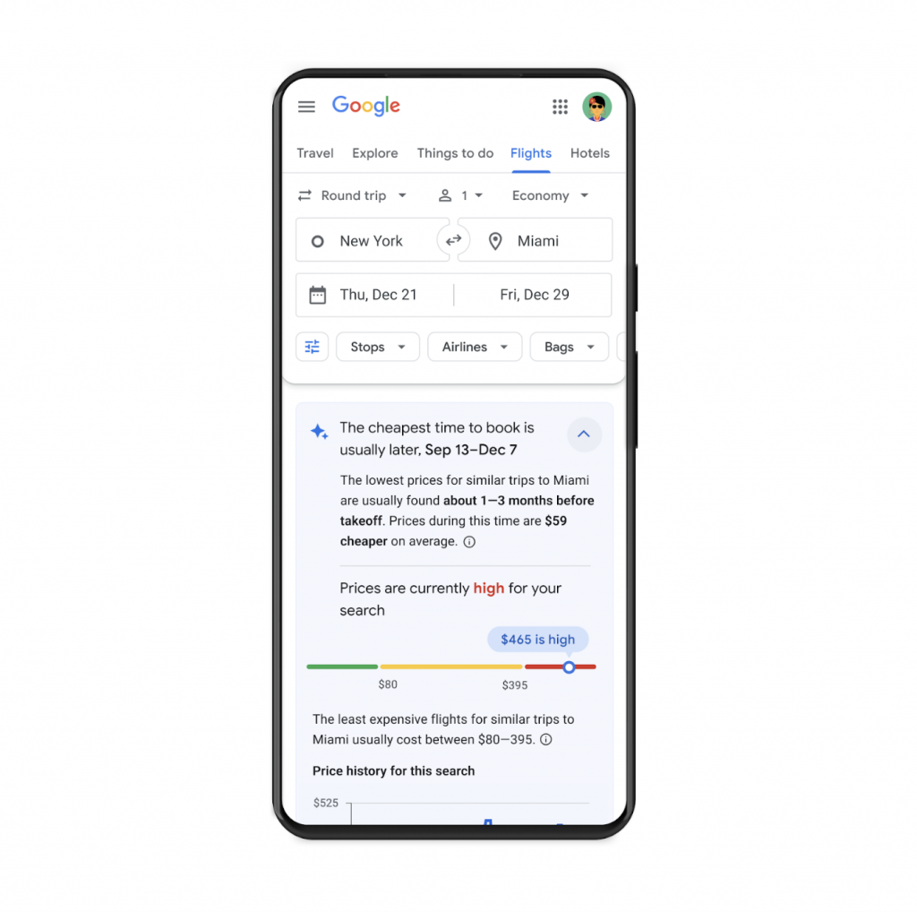 Com o novo insight sobre o melhor momento para compra, os usuários poderão ver informações sobre se os preços dos voos da pesquisa estão baixos, normais ou altos em comparação com as médias anteriores para viagens semelhantes. A informação estará disponível para os voos onde o histórico de preços é sólido, de modo a indicar o melhor momento de compra com maior precisão. As viagens que serão utilizadas para comparações serão com as mesmas durações de tempo, origem e destino, época do ano, número de escalas, classe e companhia aérea.