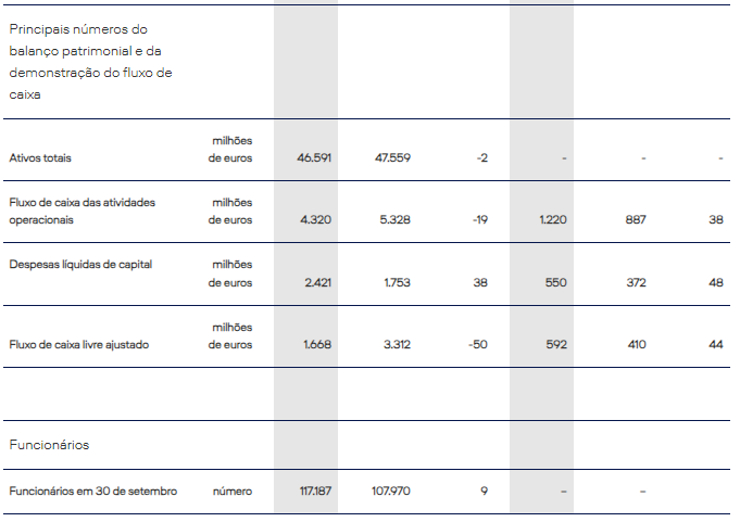 O Grupo reforçou ainda mais o seu balanço nos primeiros nove meses do ano. A dívida líquida foi significativamente inferior à do final de 2022, em 5,4 mil milhões de euros (31 de dezembro de 2022: 6,9 mil milhões de euros), devido ao fluxo de caixa livre positivo. As responsabilidades líquidas com pensões diminuíram para 1,9 mil milhões de euros (31 de dezembro de 2022: 2,0 mil milhões de euros). A liquidez disponível no final do trimestre ascendia a 11,1 mil milhões de euros (31 de dezembro de 2022: 10,4 mil milhões de euros).
