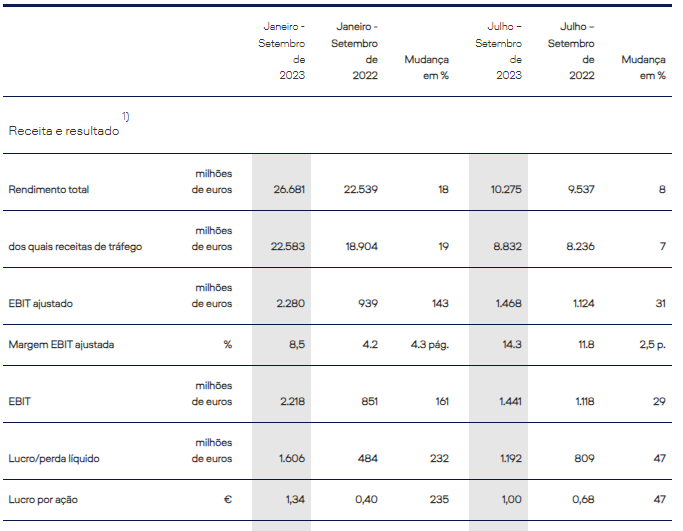 O Grupo Lufthansa gerou um resultado operacional (EBIT ajustado) de 1,5 mil milhões de euros no terceiro trimestre, o segundo melhor resultado trimestral da sua história e uma melhoria de 31% em comparação com o EBIT ajustado de 1,1 mil milhões de euros do período do ano anterior. A margem EBIT ajustada para o período do terceiro trimestre foi de 14,3 % (ano anterior: 11,8 % ). O lucro líquido do período aumentou substancialmente para 1,2 mil milhões de euros (ano anterior: 809 milhões de euros).