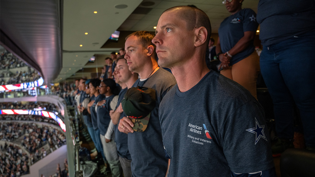 A American, junto com seus parceiros do Dallas Cowboys, recebeu 40 militares feridos de uma Unidade de Recuperação de Soldados em San Antonio para uma experiência VIP em um dia de jogo no mês passado. A American operou um fretamento privado para transportar os participantes de San Antonio para Dallas-Fort Worth, onde foram recebidos com boas-vindas de heróis na chegada. Os veteranos aproveitaram o jogo do Dallas Cowboys em uma suíte privada e a chance de entrar em campo após o jogo.