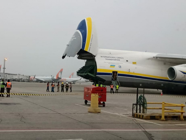 Antonov AN124-100M de prefixo UR-82007 que decolou de Paramaribo no Suriname com 99 toneladas de cargas contendo máscaras de proteção .