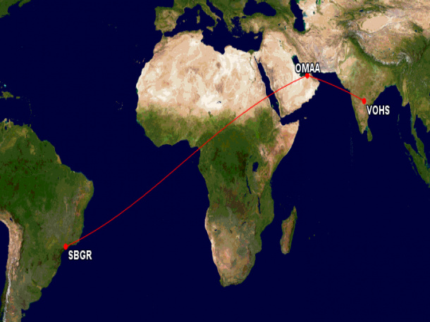 Primeira etapa o avião B777-3FX(ER) de prefixo A6-ETG será carregado no Aeroporto Internacional Rajiv Gandhi (VOHS/HYD) localizado na cidade de Hyderabad capital do estado de Telangana na Índia e partirá tendo como destino o Aeroporto Internacional de Abu Dhabi (OMAA/AUH), onde fará uma escala técnica devido ao fato de não existir voo direto entre a Índia e o Brasil. A segunda etapa será entre o Aeroporto de Abu Dhabi e o Aeroporto Internacional de São Paulo (SBGR/GRU), partindo no dia seguinte para Abu Dhabi. Confira: