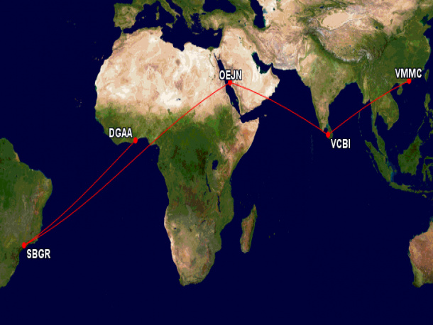 Está prevista a vinda ao Brasil do B747 da Fly Pro nos próximos dias para cumprir o voo PVV8652 que terá inicio no dia 15/05 no Aeroporto Internacional de Macau (VMMC/MFM) localizado na Ilha de Taipa em Macau de lá o avião seguirá até o Aeroporto Internacional de Bandaranaike no Sri Lanka (VCBI/CMB), no dia seguinte 16/05 a aeronave partirá com destino ao Aeroporto Internacional Rei Abdulaziz (OEJN/JED) em Gidá na Arábia Saudita, no dia 17/05 o pouso será realizado no Aeroporto Internacional de Conakry (GUCY/CKY) na Guiné, seguindo para o Aeroporto Inernacional de São Paulo/Guarulhos (SBRP/GRU). Nas primeiras horas do dia 18/08 o B747 deverá decolar rumo ao Aeroporto Internacional de Kotoka (DGAA/ACC) na cidade de Acra em Gana para cumprir o voo PVV8653. Não nos foi informado o tipo de carga que será transportada ao Brasil.