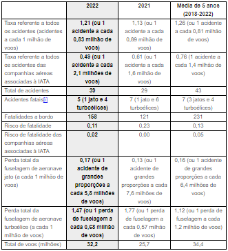 A Associação Internacional de Transporte Aéreo (IATA – International Air Transport Association) divulgou o Relatório de Segurança da aviação global de 2022. O relatório apresentou redução no número de acidentes fatais e no risco de fatalidade em relação a 2021 e à média de cinco anos (2018-2022).