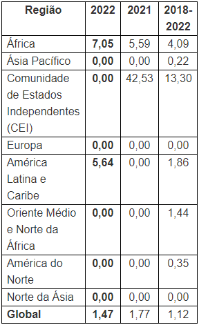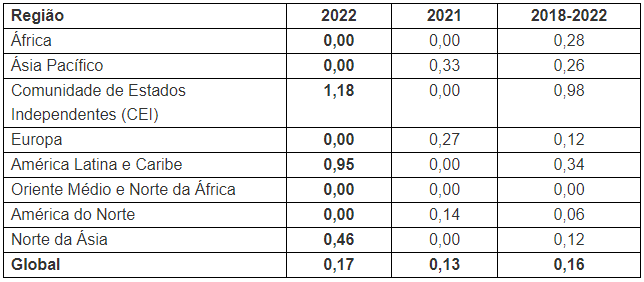 Seis regiões apresentaram melhoria ou nenhuma deterioração no índice de perda de fuselagem de aeronave turbo em 2022 em relação à média de cinco anos. As duas regiões que apresentaram aumento na comparação com a média de cinco anos foram América Latina/Caribe e África Subsaariana.