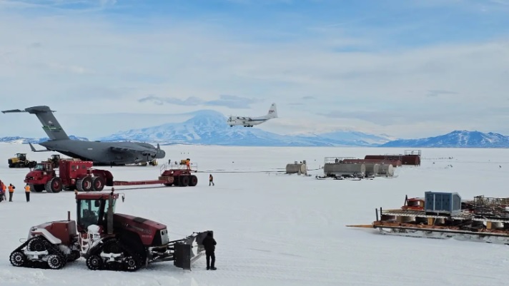 A aeronave Wallops Flight Facility C-130 da NASA, mostrada nesta imagem de 28 de outubro de 2023, entregou a carga útil do Observatório Espectroscópico Terahertz Galáctico/Extragaláctico ULDB (GUSTO) para a Estação McMurdo, Antártica. Esta foi a primeira missão do avião à Antártica .