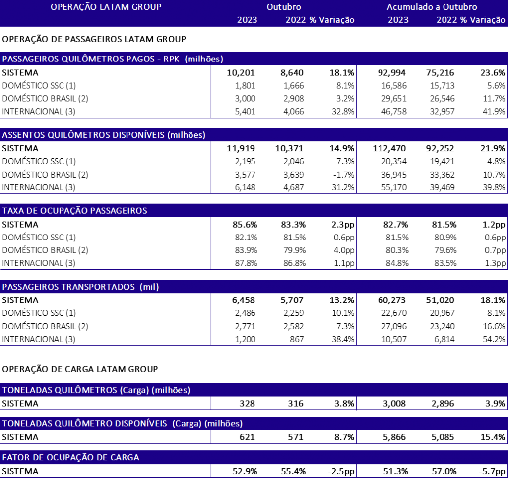 Em outubro de 2023, a demanda de passageiros (medida em RPK¹) de todo o grupo LATAM teve crescimento de 18% em relação ao mesmo mês de 2022. No mesmo período, a companhia promoveu aumento de 15% na sua oferta de assentos (medida em ASK²). Já na operação cargueira, a empresa ampliou em 8,7% a sua capacidade (medida em ATK³) em relação a outubro de 2022. Confira os resultados completos abaixo: