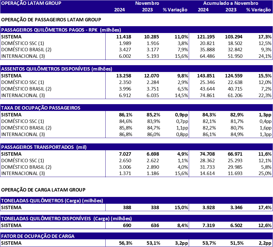 Ao longo do mês de novembro, o Grupo LATAM transportou 7 milhões de passageiros, um crescimento de 4,9% na comparação com o mesmo mês de 2023. De janeiro a novembro deste ano, foram transportados 74,7 milhões de passageiros pelo grupo, o que representa um crescimento de 11,6% com relação ao mesmo período do ano anterior e supera a quantidade total de passageiros transportados durante todo o ano de 2023.