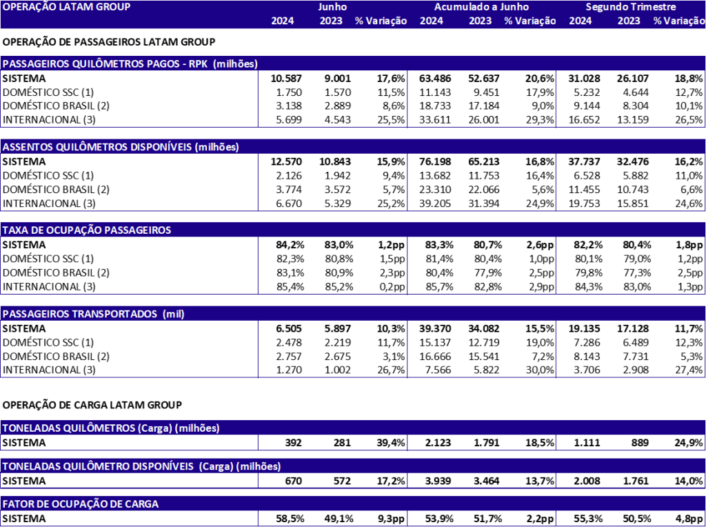 O grupo LATAM transportou mais de 6,5 milhões de passageiros em junho, número 10,3% acima do mesmo mês em 2023. Desta forma, durante o segundo trimestre, o grupo movimentou 19,1 milhões de passageiros, crescimento de 11,7% com relação ao mesmo trimestre do ano anterior.