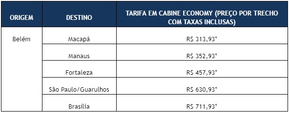 Dentre as tarifas disponíveis, o cliente encontra passagens de Belém para Macapá por R$ 313,93* (preço por trecho com taxas inclusas). Outra oportunidade é para o voo Belém-Manaus, com passagens a partir de R$ 352,93* (preço por trecho com taxas inclusas).