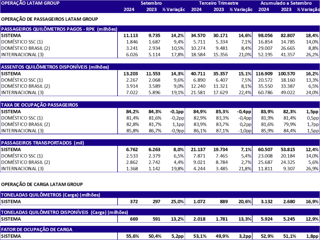 Globalmente, o grupo LATAM também registrou 15,1% de crescimento na sua oferta total de assentos (ASK¹) no trimestre, impulsionado por um incremento de 22,4% na oferta de assentos internacionais e de 7,5% na oferta de assentos domésticos das suas afiliadas no Chile, Colômbia, Equador e Peru. Já a demanda (RPK²) global do grupo LATAM teve crescimento de 14,6% no período. Ao todo, o grupo LATAM transportou mais de 21,1 milhões de passageiros no terceiro trimestre, resultado 7,1% acima do mesmo período em 2023. Deste total, mais de 9 milhões de passageiros foram transportados pela LATAM Brasil.
