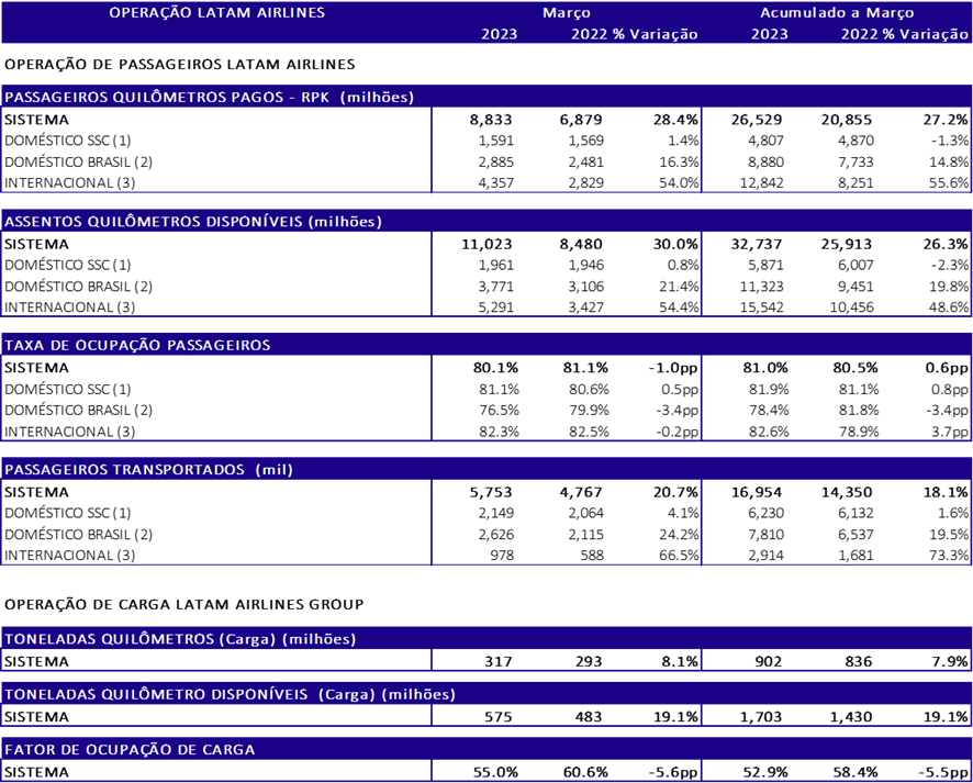 Em março de 2023, a demanda de passageiros (medida em RPK*) do grupo LATAM teve crescimento de 28,4% na comparação com o mesmo mês de 2022. No mesmo período, a companhia promoveu o aumento de 30% na sua oferta de assentos (medida em ASK**). Como resultado, registrou um recuo de 1 ponto percentual em sua taxa média de ocupação, para 80,1%. Na operação cargueira, a taxa de ocupação foi de 55%, o que corresponde a uma redução de 5,6 pontos percentuais em relação ao índice registrado em março de 2022.