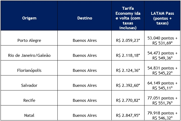 A partir de R$ 1.857,07* (preço de ida e volta com taxas inclusas) ou 48.381 pontos LATAM Pass + R$ 463,71* o cliente encontra voos entre São Paulo e Buenos Aires. Outra oferta especial são os voos na rota Curitiba-Santiago, que inaugura em 1º de novembro, com passagens a partir de R$ 1.964,18* (preço de ida e volta com taxas inclusas) ou 64.257 pontos LATAM Pass + R$ R$ 281,82*. Confira outras ofertas para destinos internacionais em cabine Economy: