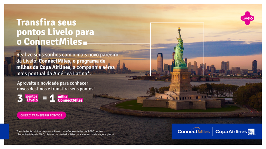 Livelo e Copa Airlines lançam parceria que permite a transferência de pontos em milhas ConnectMiles, programa de fidelidade da companhia aérea