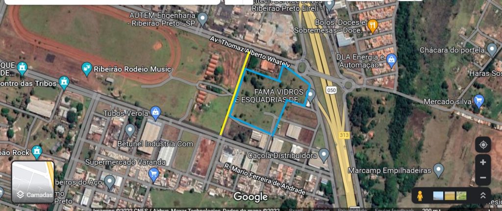 Abaixo contornamos em azul a área destinada para a construção dos galpões e em amarelo a avenida que liga o empreendimento a avenida do aeroporto da cidade.