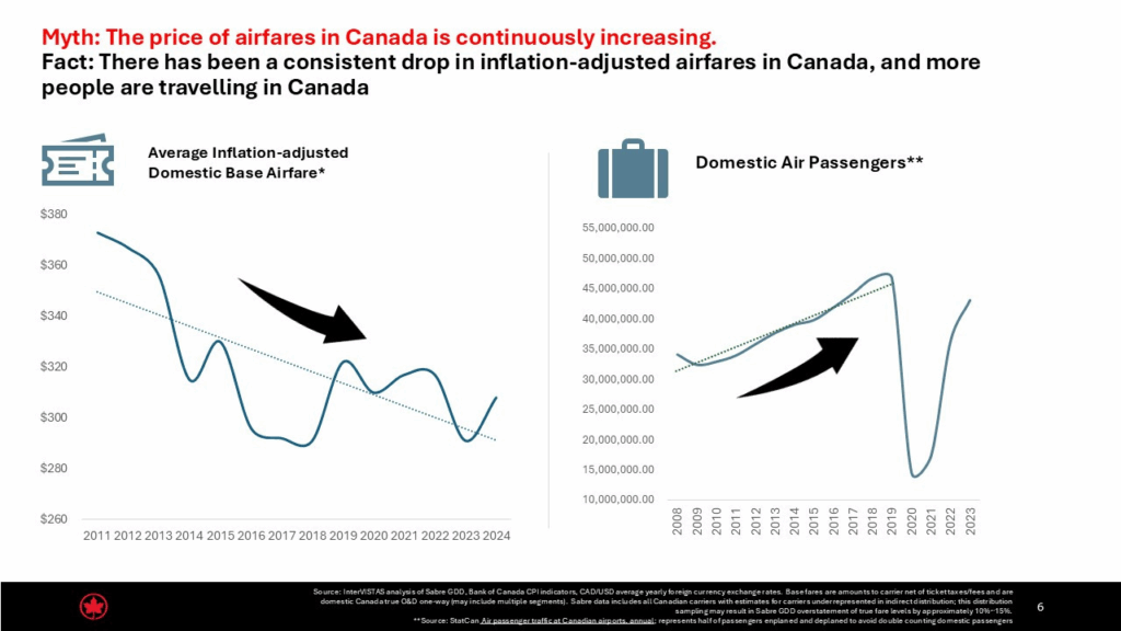 A Air Canada apoia iniciativas que visam fortalecer o setor aéreo canadense em benefício dos consumidores e de todas as partes interessadas. Como parte disso, interagimos regularmente com governos e outros parceiros do setor. Em nossa submissão ao Escritório de Concorrência do Canadá para seu estudo de mercado sobre a concorrência em serviços aéreos domésticos de passageiros no Canadá, fornecemos informações contextuais essenciais para que os tomadores de decisão entendam melhor as oportunidades reais de aprimoramento do sistema. Isso ilustra alguns mitos e fatos sobre a concorrência e as questões em questão, como o preço das passagens aéreas. Como a companhia aérea de bandeira do Canadá e a companhia aérea com a maior rede e mais serviços no Canadá, temos um profundo interesse em um mercado doméstico forte e competitivo para melhor atender nossos clientes.