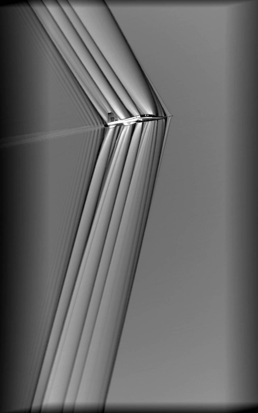 À medida que os raios de luz fluem em torno de uma aeronave, a mudança na densidade do ar causada pelo fluxo de ar curva a luz, fazendo com que a borda do Sol e as manchas solares pareçam se mover. O software então calcula como cada ponto se moveu e reconstrói a onda de choque em uma imagem de Schlieren.