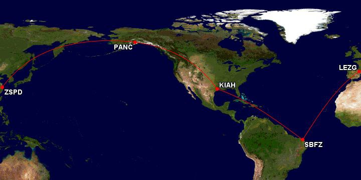 O Boieng B737 irá decolar carregado do Aeroporto Internacional de Pudong (PVG/ZSPD) localizado em Xangai na China no dia amanhã 18/03 para realizar o voo NCR658 em primeira etapa com destino ao Aeroporto Internacional Ted Stevens de Anchorage (ANC/PANC) localizado no Alasca – Estados Unidos, no dia 19/03 o B747 decola do Alasca realizando a segunda etapa do voo NCR658 com destino ao Aeroporto Intercontinental George Bush (IAH/KIAH) localizado em Huston no estado americano do Texas, ainda no dia 19 a aeronave decola de Huston para realizar o voo NCR4858 com destino ao Brasil pousando no Aeroporto Internacional Pinto Martins (FOR/SBFZ) localizado em Fortaleza-CE, de onde deverá decolar no dia 22/03 cumprindo o voo NCR814 com destino ao Aeroporto de Saragoça (ZAZ/LEZG) localizado na cidade de Saragoça em Aragão na Espanha.